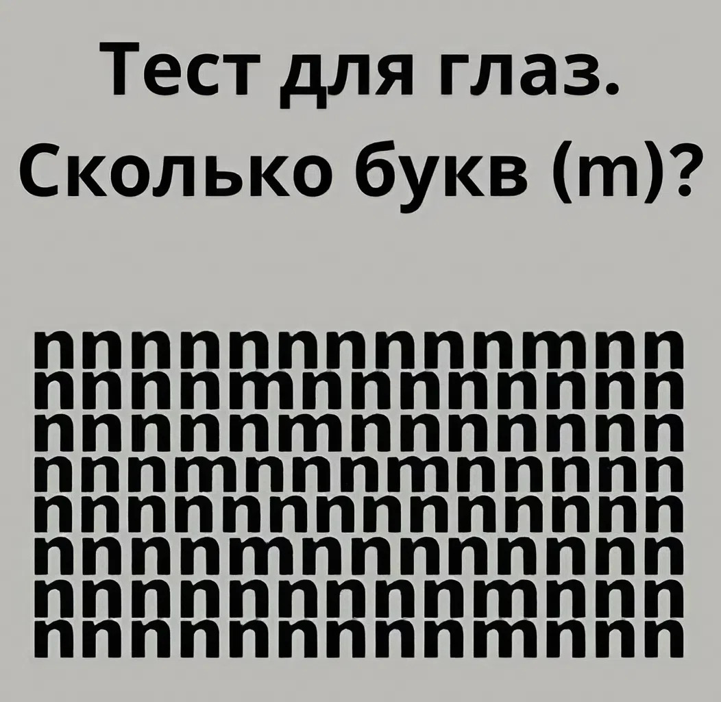 С первого взгляда кажется, что все просто и банально, но это не так? Однако буквы “м” очень сложно найти среди большого количества строчных “н”. Благодаря этому тесту вы можете проверить насколько внимательными являетесь, а еще научитесь быть более терпеливыми и усидчивыми.
